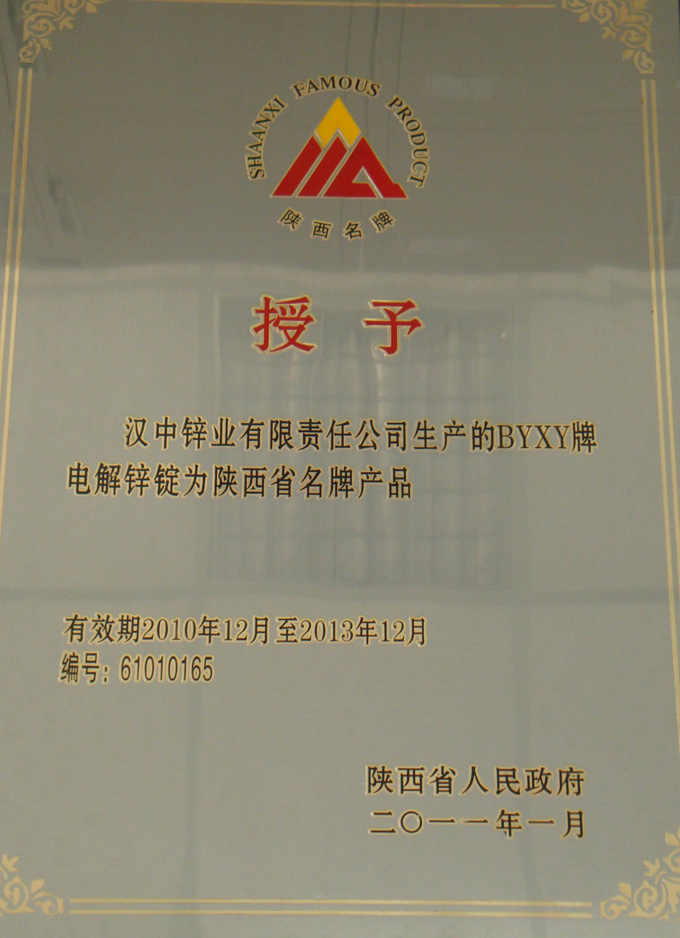 2011年1月,公司生產(chǎn)的BYXY牌電解鋅錠再次榮獲陜西省“名牌產(chǎn)品”稱號(hào) -